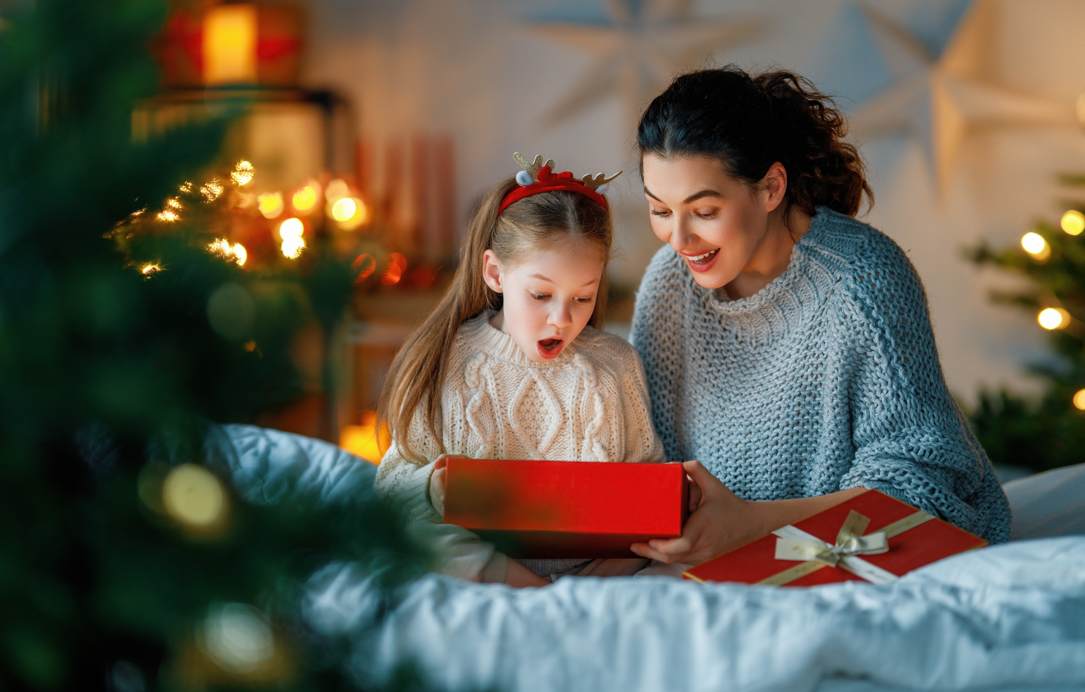 Merry Christmas and Happy Holidays. Cheerful mom and her cute daughter girl exchanging gifts. Parent and little child having fun near tree indoors. Loving family with presents in room.